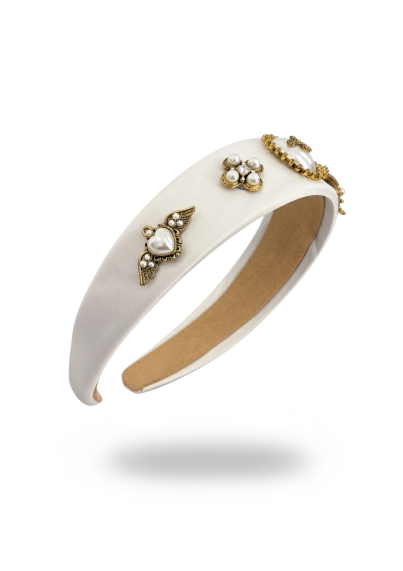 Il raso funge da base raffinata per le decorazioni gioiello, dov’è piccole api dorate, perle luminose e cristalli tagliati con precisione creano un gioco di luce e sofisticato. Ogni elemento è applicato singolarmente a mano, rendendo ogni pezzo un’opera unica e irripetibile.