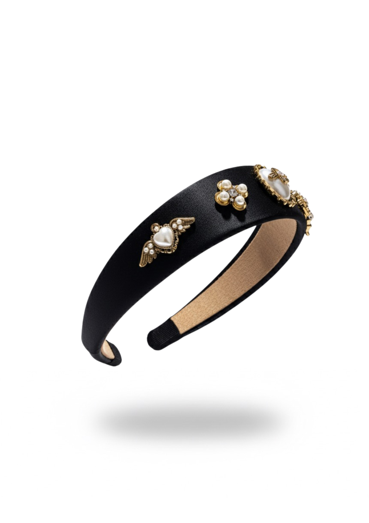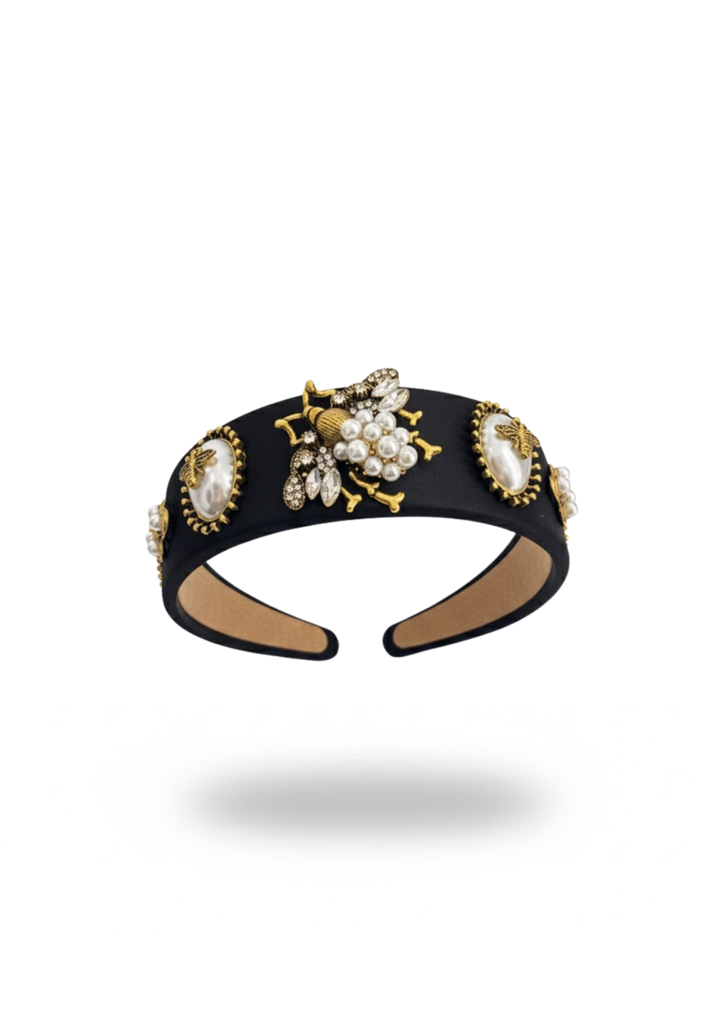 CERCHIETTO NERO ARTIGIANALE IN RASO CON DETTAGLI GIOIELLO E MOTIVO APE IN PERLE E CRISTALLI