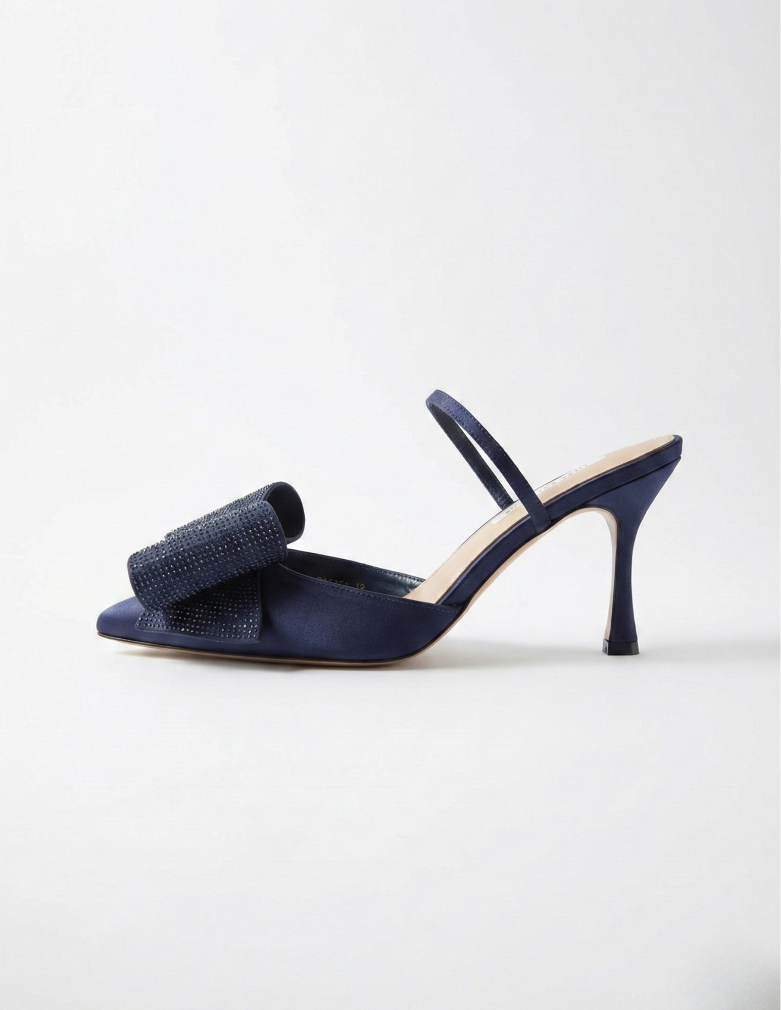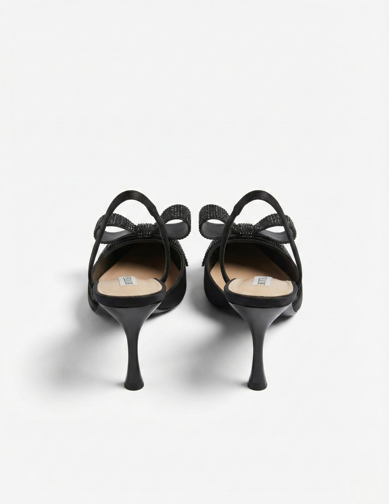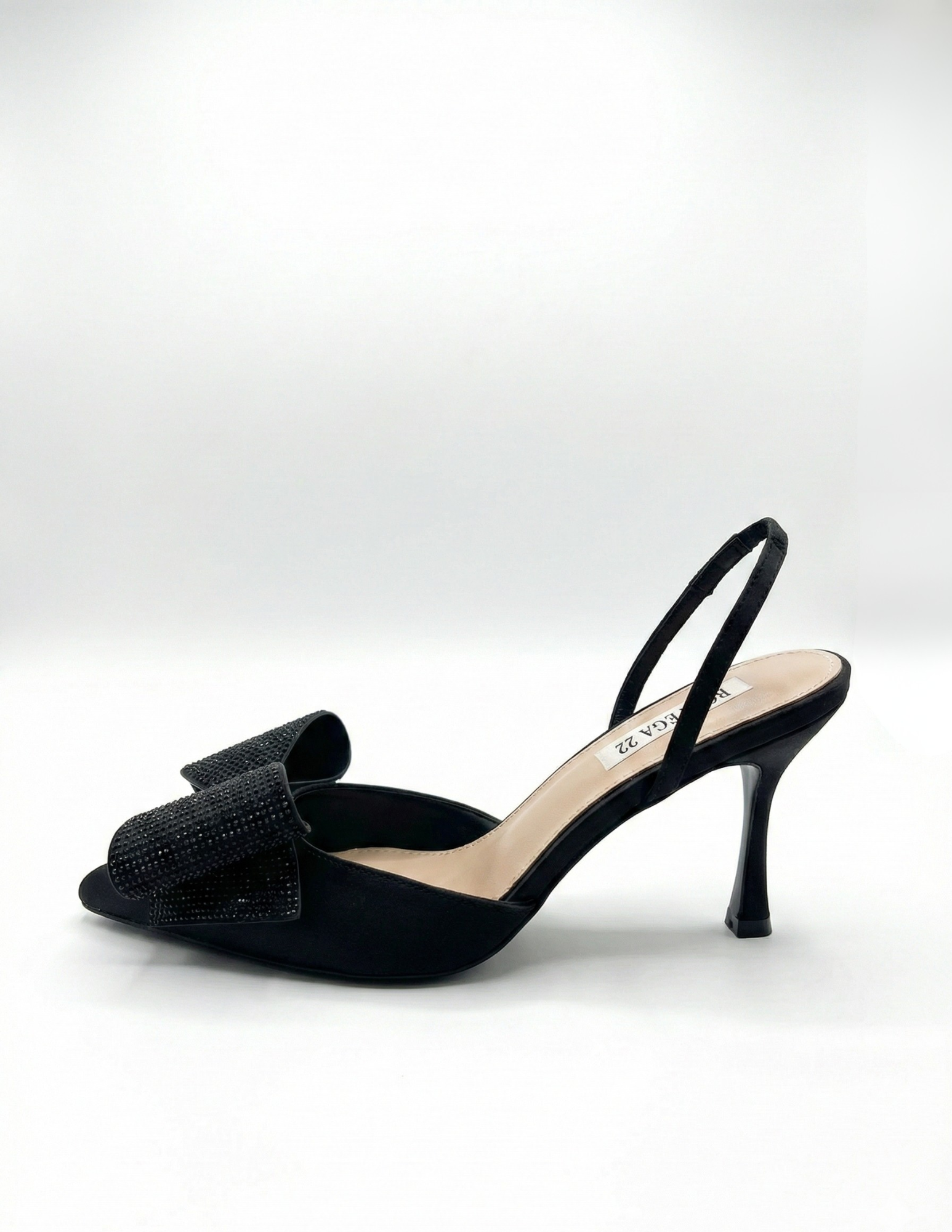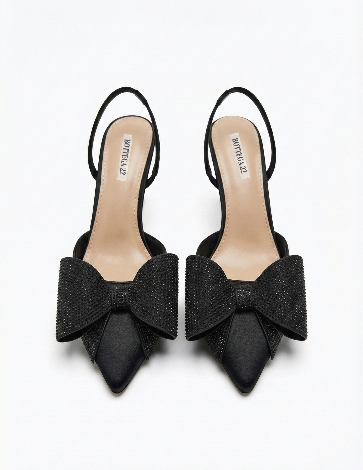 Questa décolleté slingback in raso è la scelta perfetta per chi desidera un look raffinata e d’impatto. Il maxi fiocco frontale impreziosito da micro strass dona luminosità e carattere, trasformando una silhouette classica in un vero statement di stile.