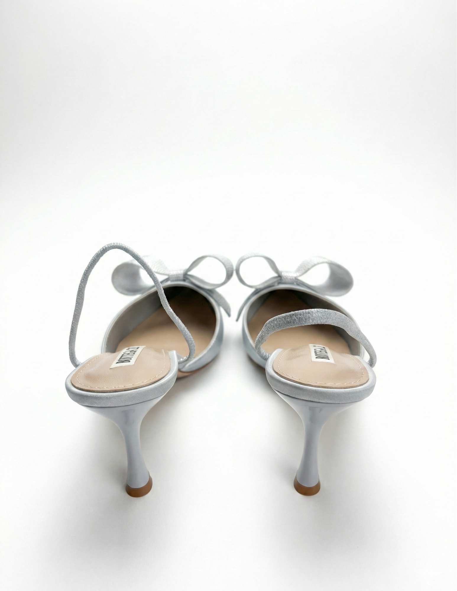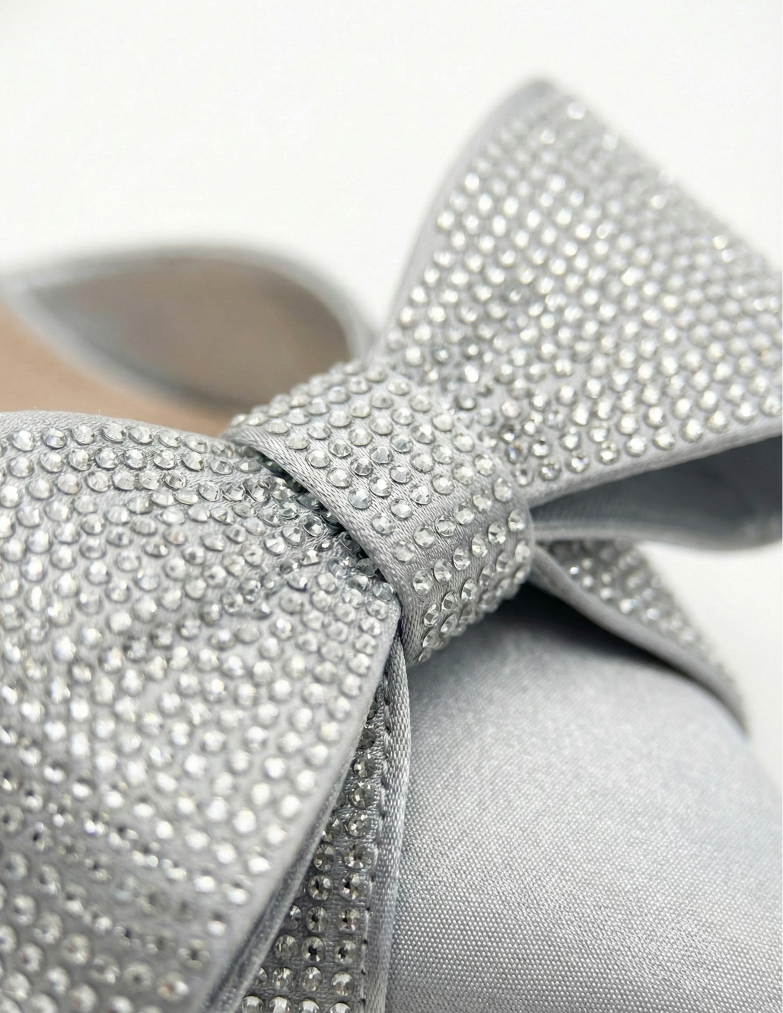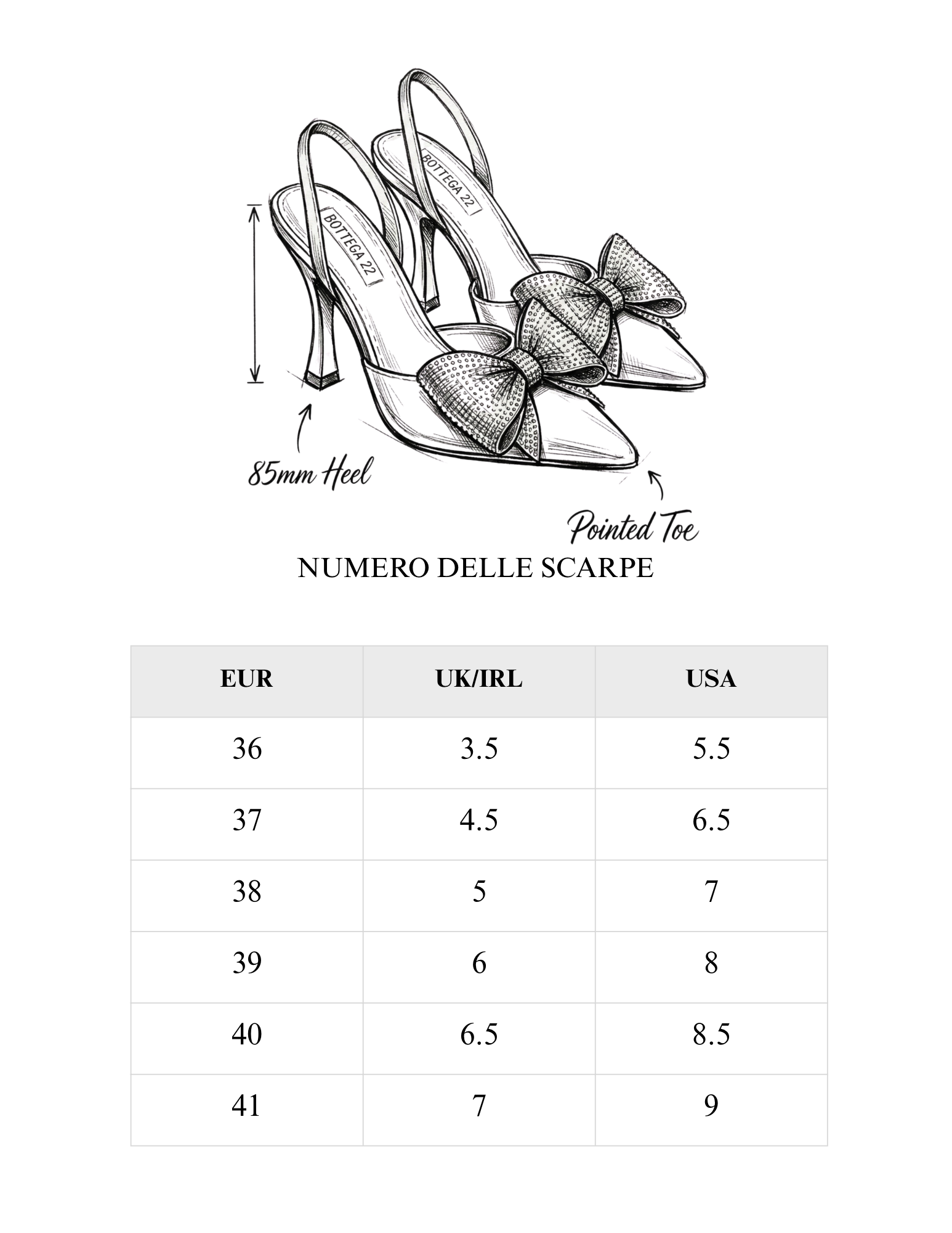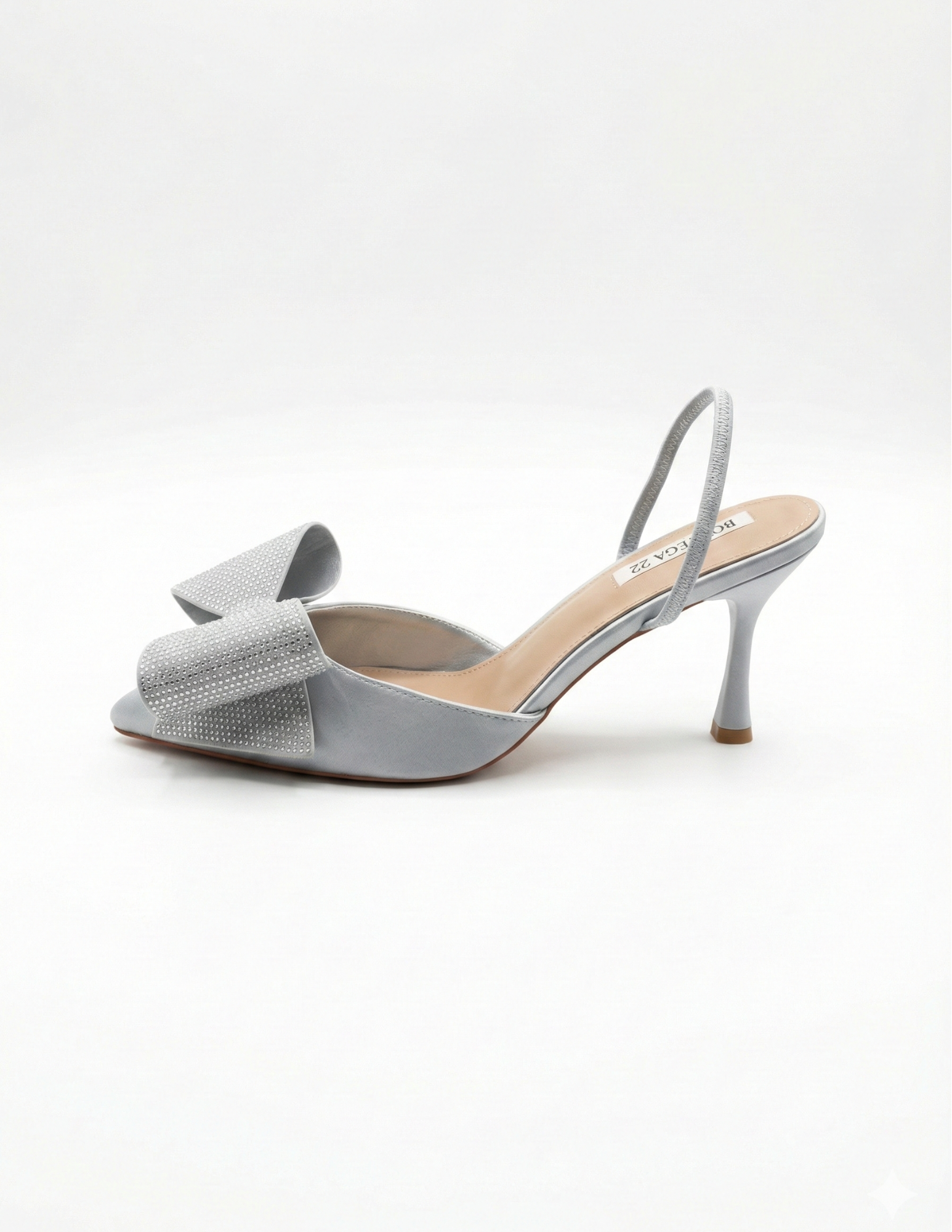 Questa décolleté slingback in raso è la scelta perfetta per chi desidera un look raffinata e d’impatto. Il maxi fiocco frontale impreziosito da micro strass dona luminosità e carattere, trasformando una silhouette classica in un vero statement di stile.