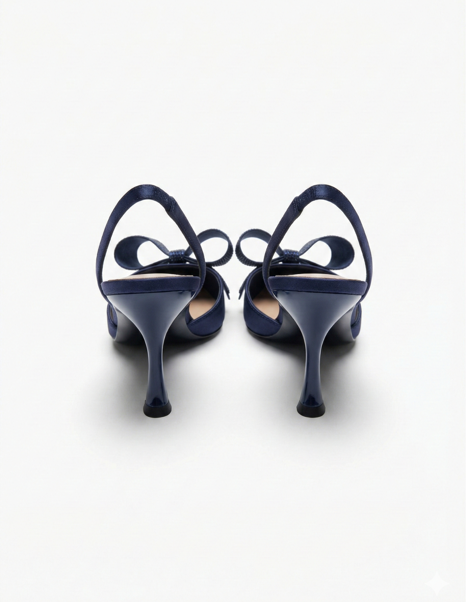 La punta affusolata slancia la figura, mentre il cinturino posteriore assicura una calzata in raso rivestito su basse in eco-pelle di alta qualità, selezionata per garantire confort, resistenza e un approccio più responsabile.