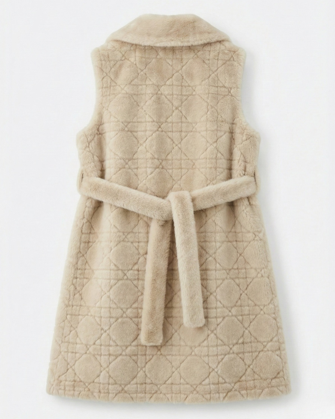Gilet Beige in Pelliccia Sintetica Smanicate con Ganci e Cintura – Taglia Unica