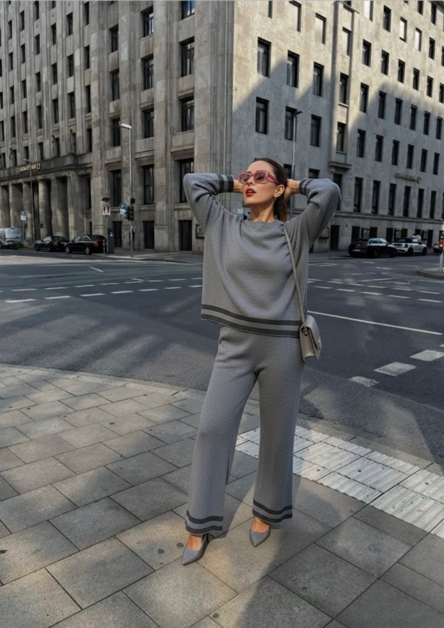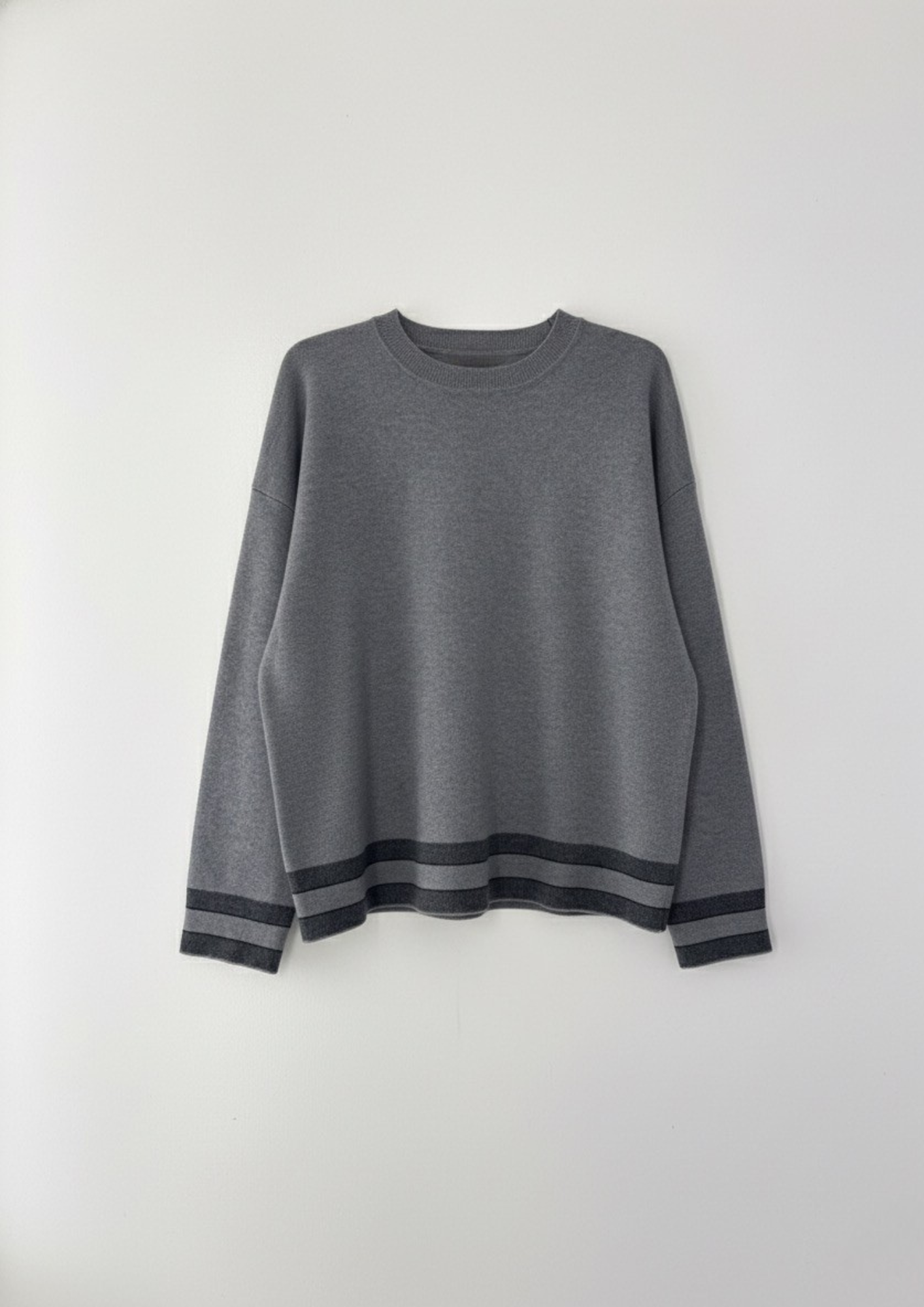 Il design pulito è impreziosito da bordi a righe tono su tono, che aggiungono un tocco grafico dal gusto contemporaneo. La struttura del tessuto garantisce calore e comfort, mantenendo un profilo raffinato e versatile per ogni giorno.