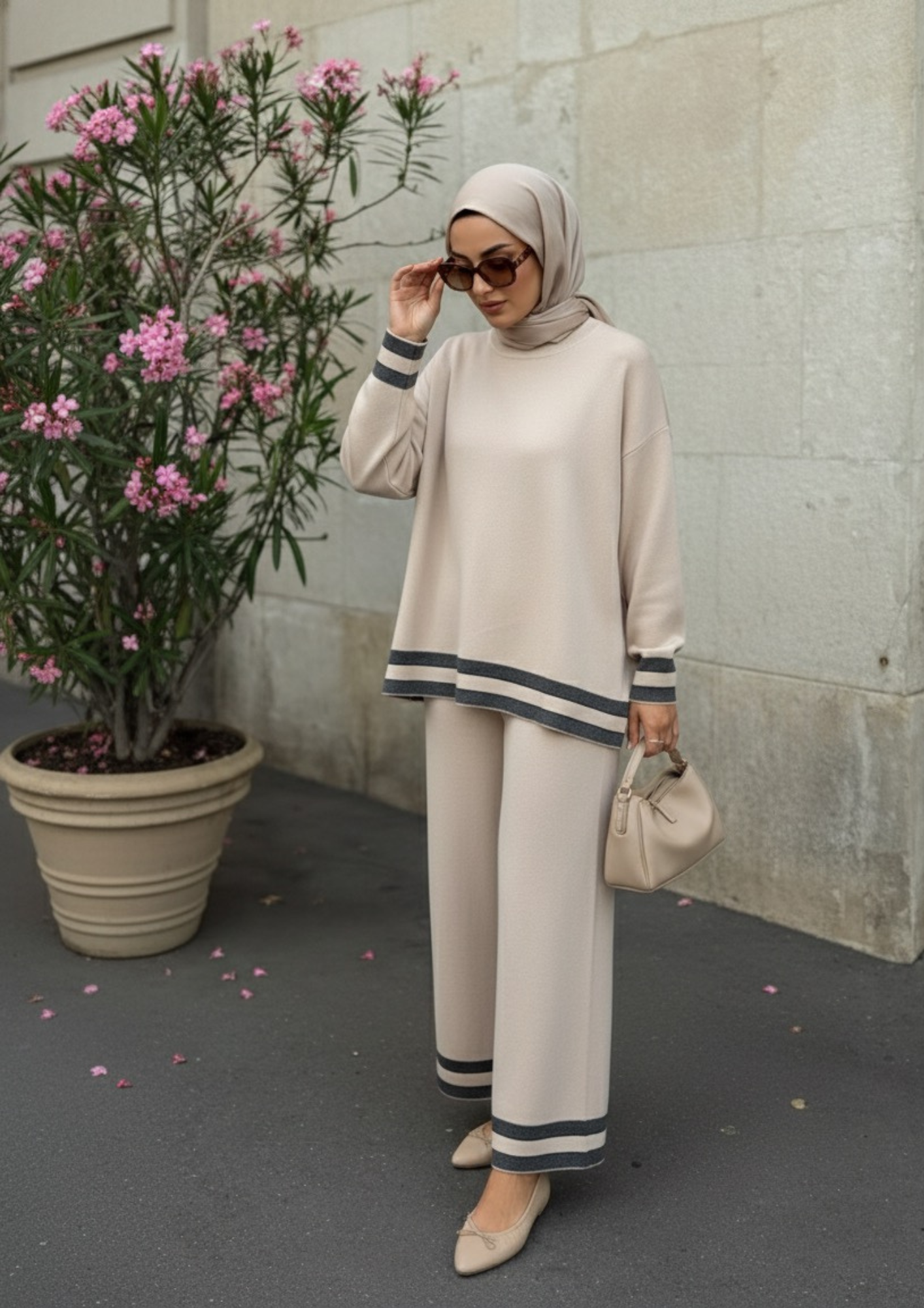 Il design pulito è impreziosito da bordi a righe tono su tono, che aggiungono un tocco grafico dal gusto contemporaneo. La struttura del tessuto garantisce calore e comfort, mantenendo un profilo raffinato e versatile per ogni giorno.