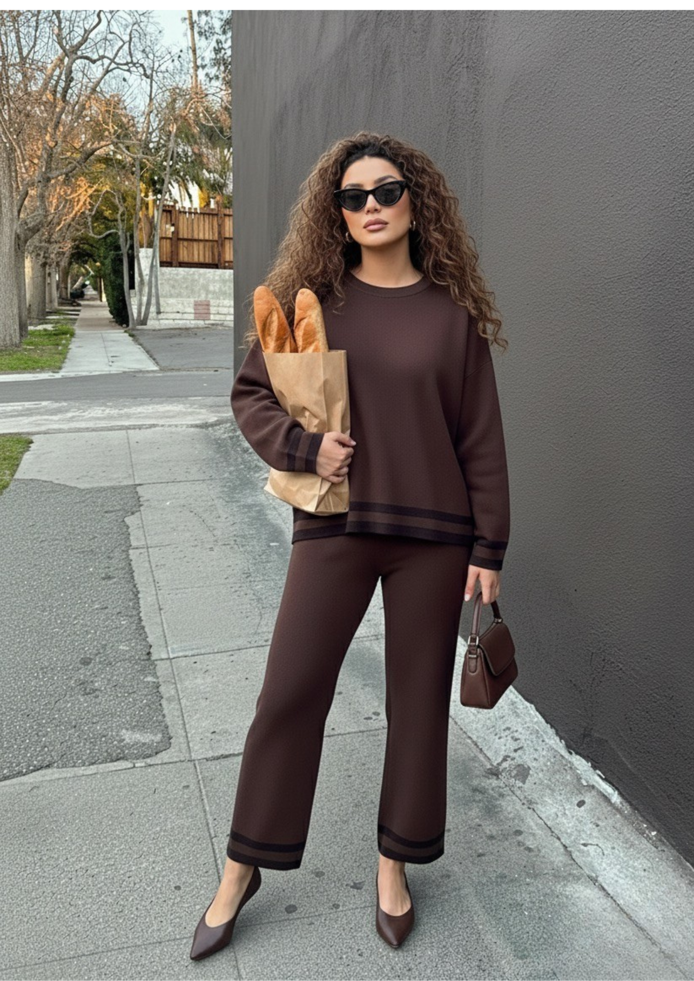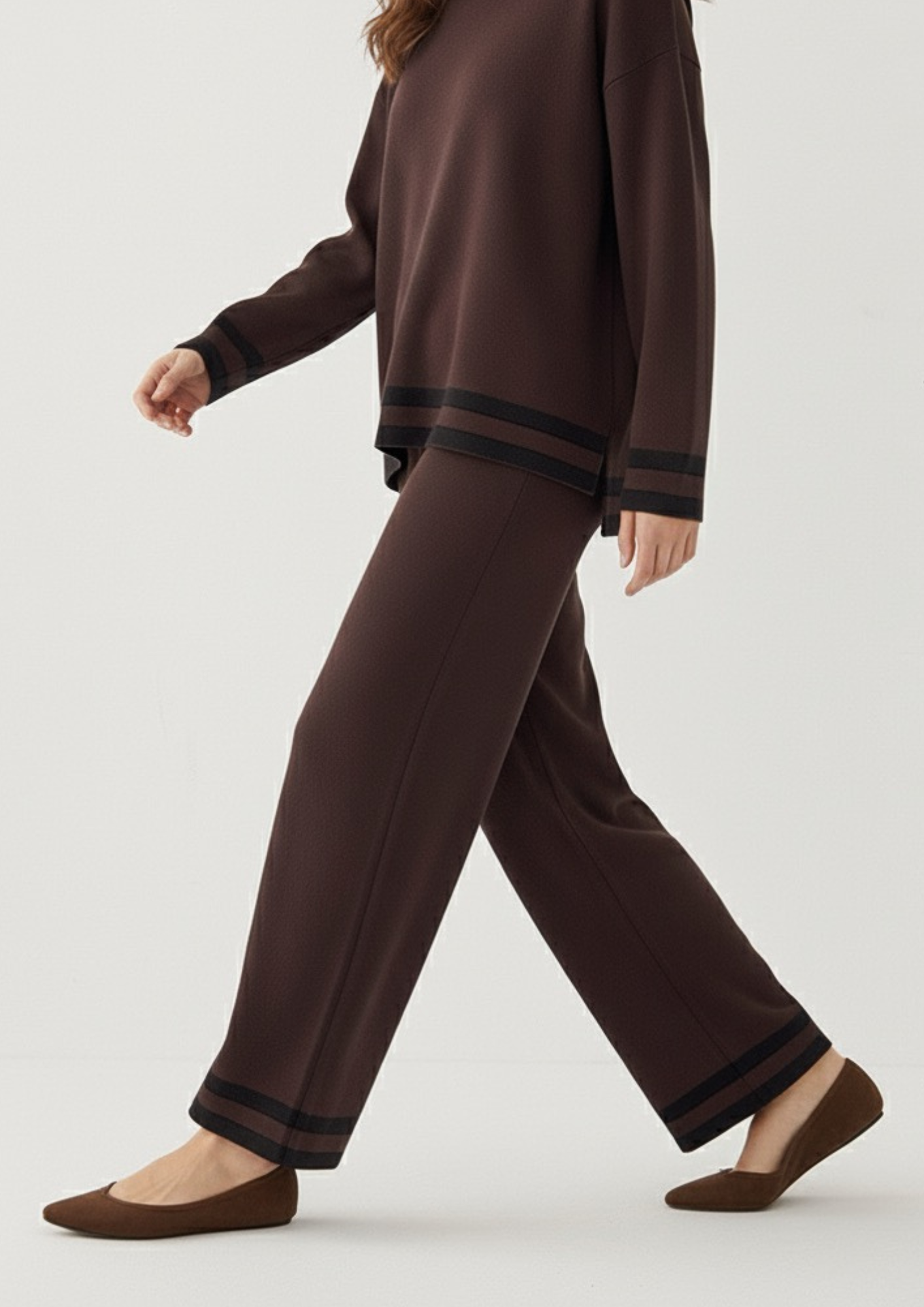 Il design pulito è impreziosito da bordi a righe tono su tono, che aggiungono un tocco grafico dal gusto contemporaneo. La struttura del tessuto garantisce calore e comfort, mantenendo un profilo raffinato e versatile per ogni giorno.