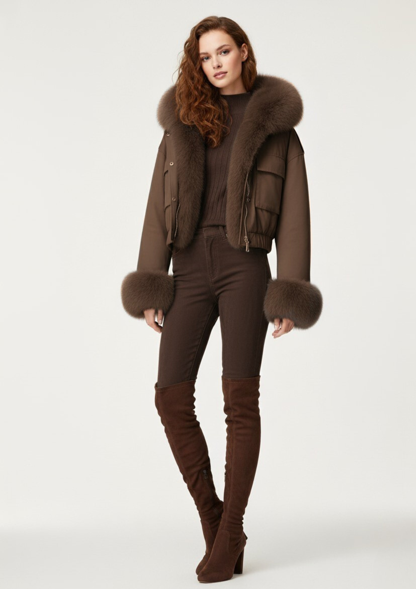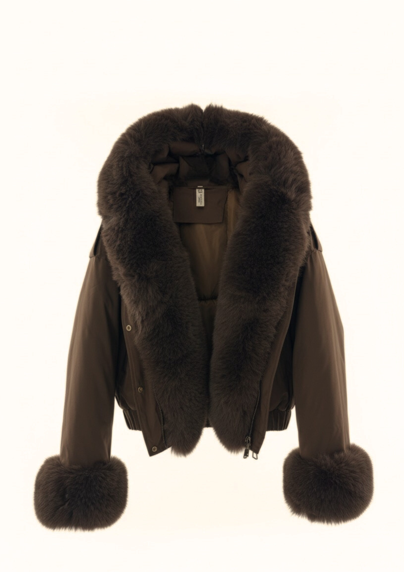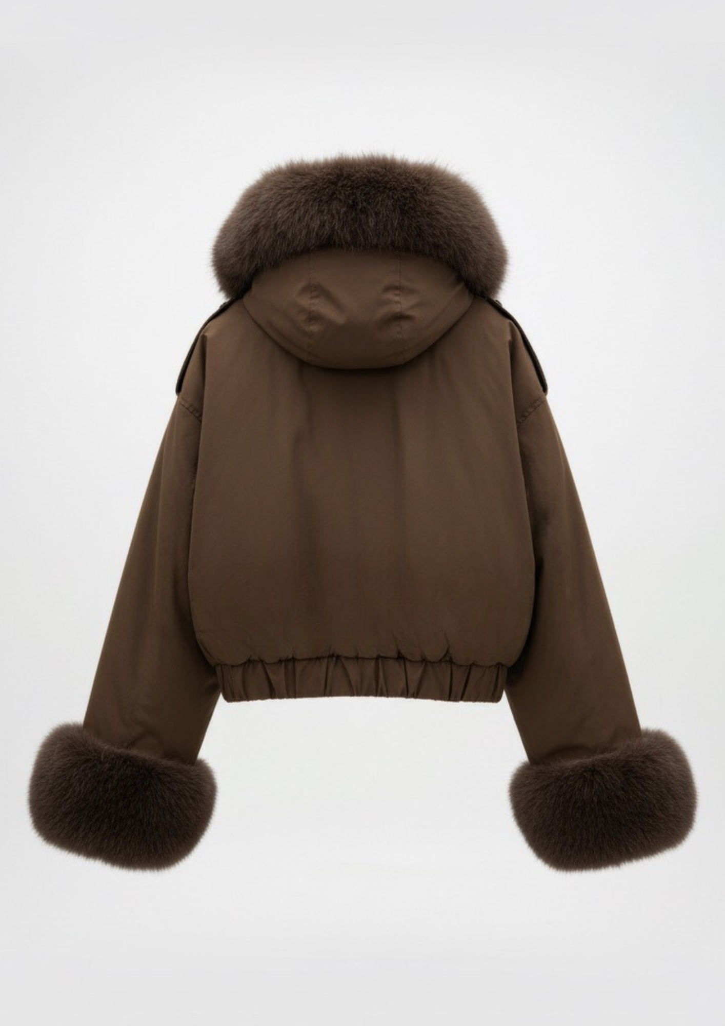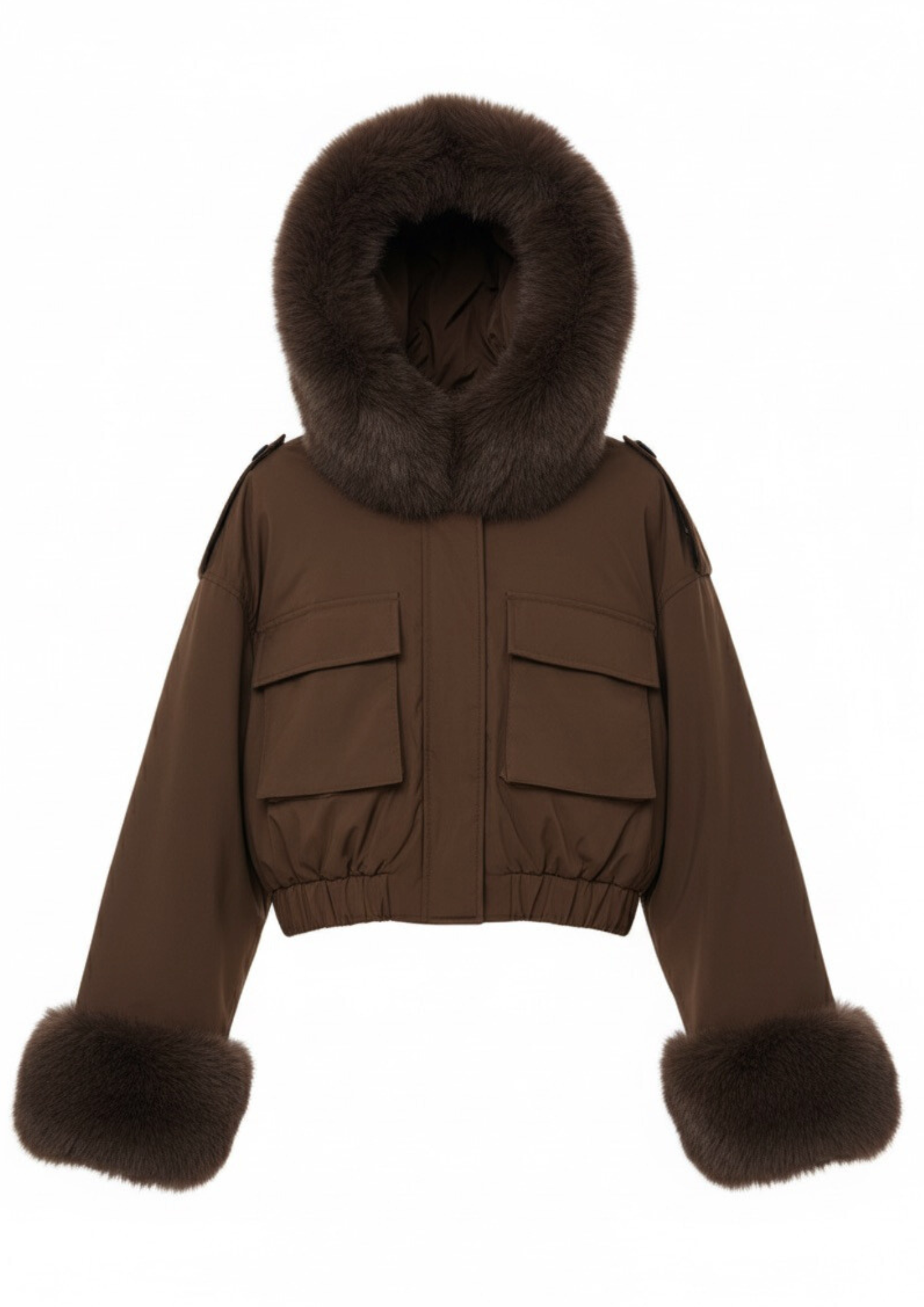 Piumino Marrone Corto Impermeabile con Cappuccio e Pelliccia Staccabile