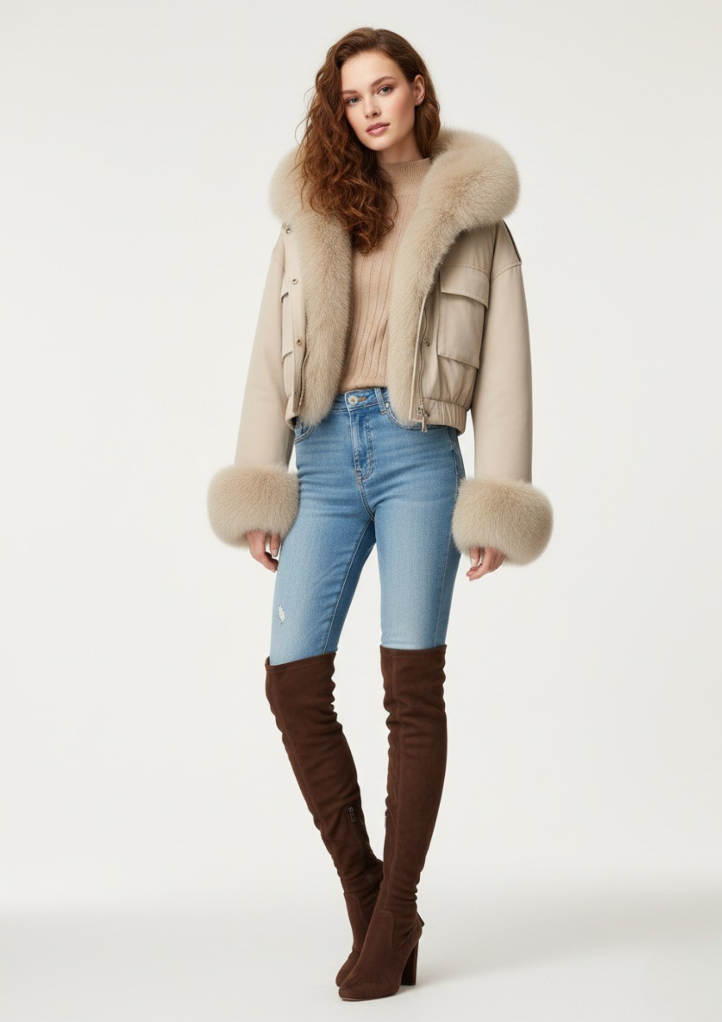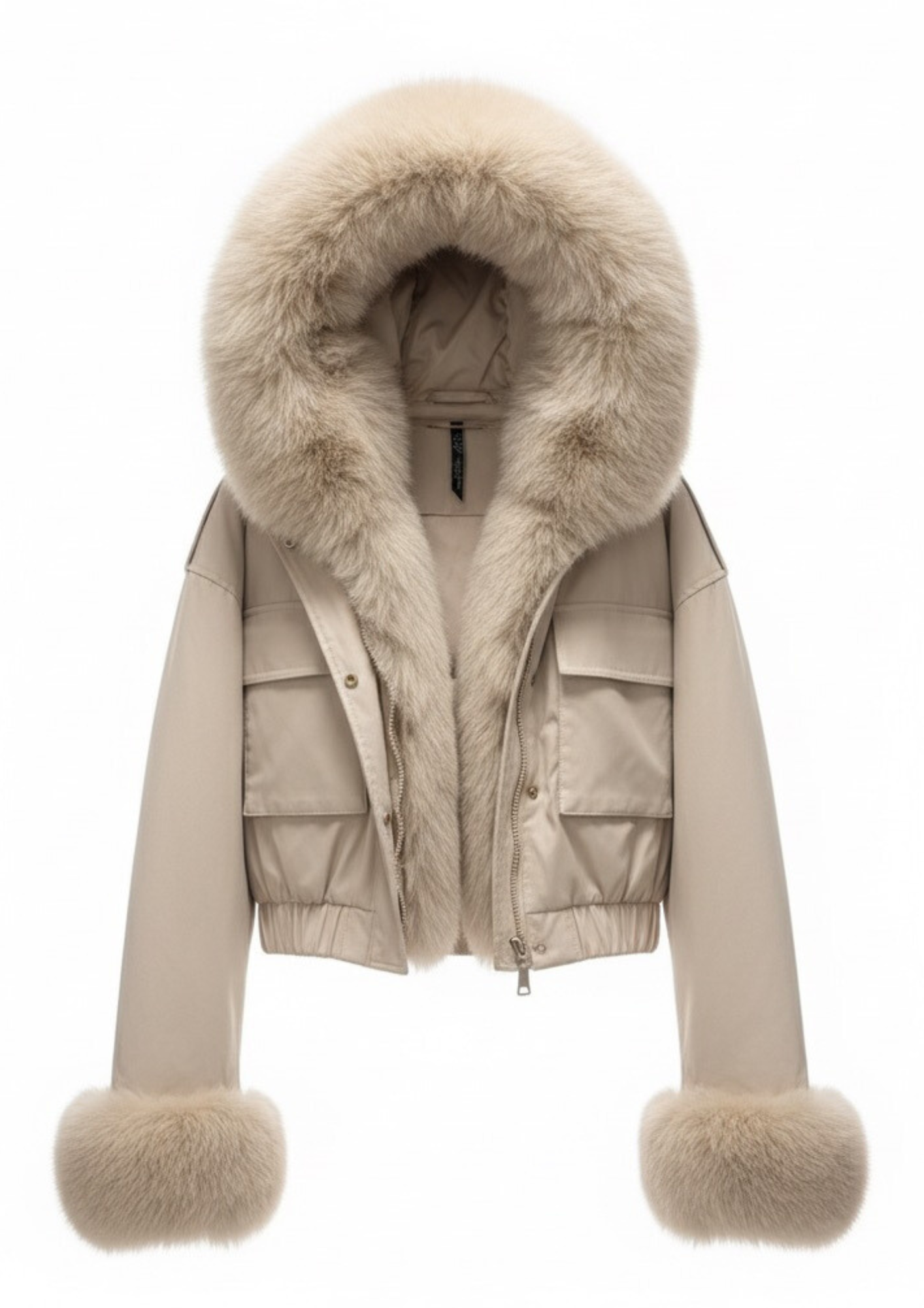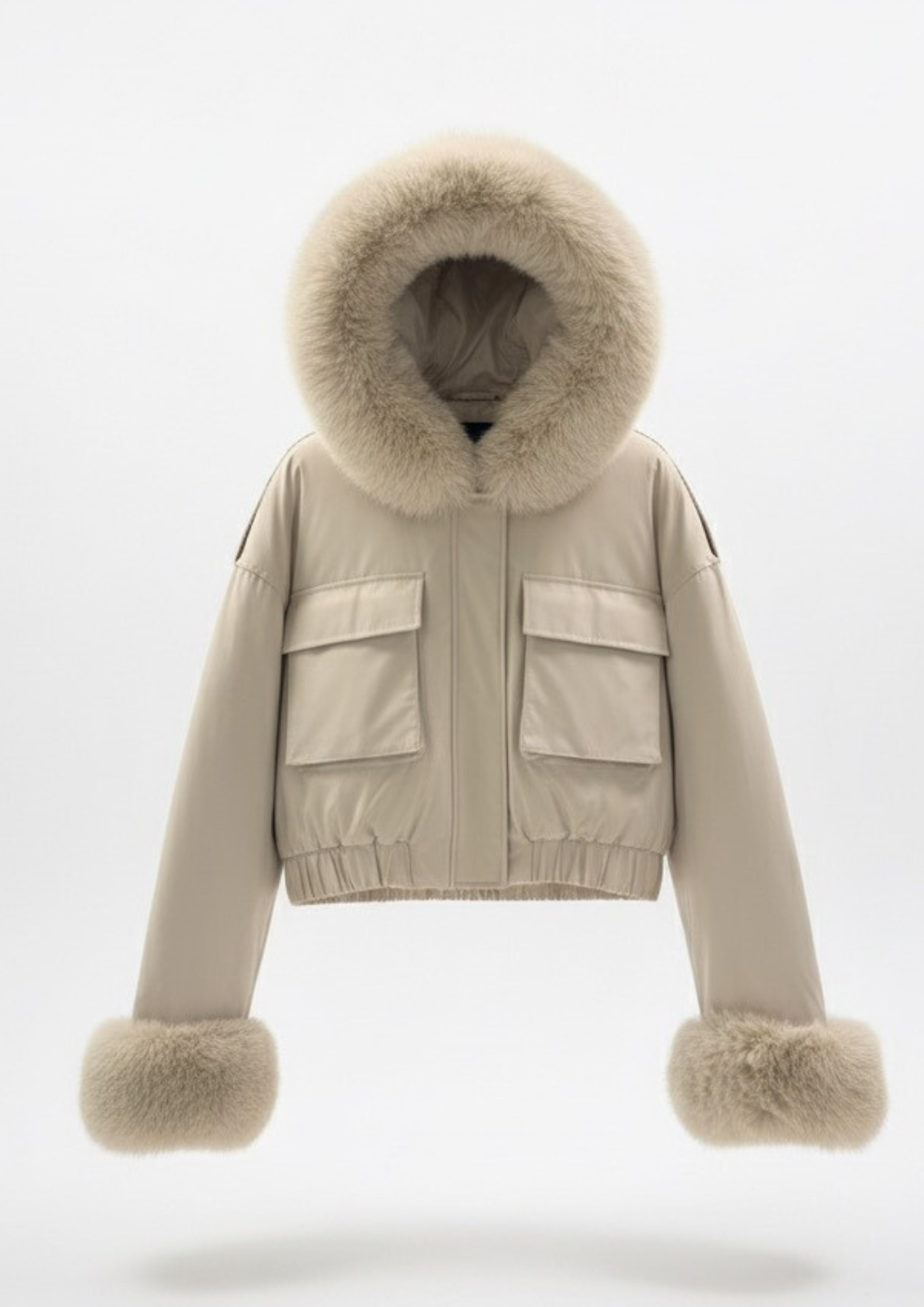 Piumino Beige Corto Impermeabile con Cappuccio e Pelliccia Staccabile