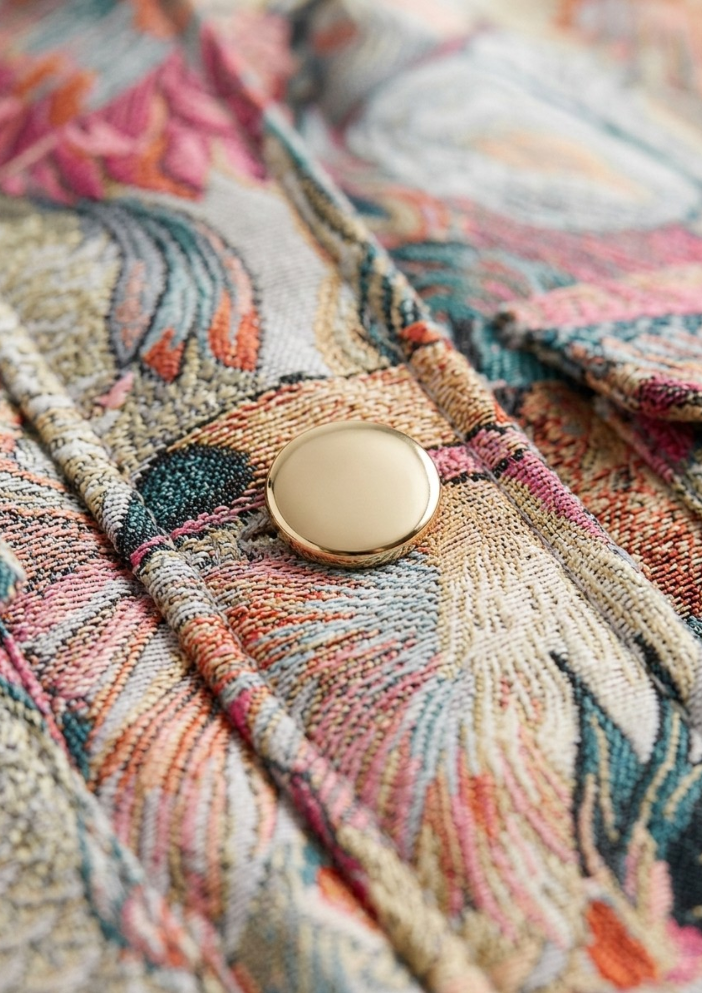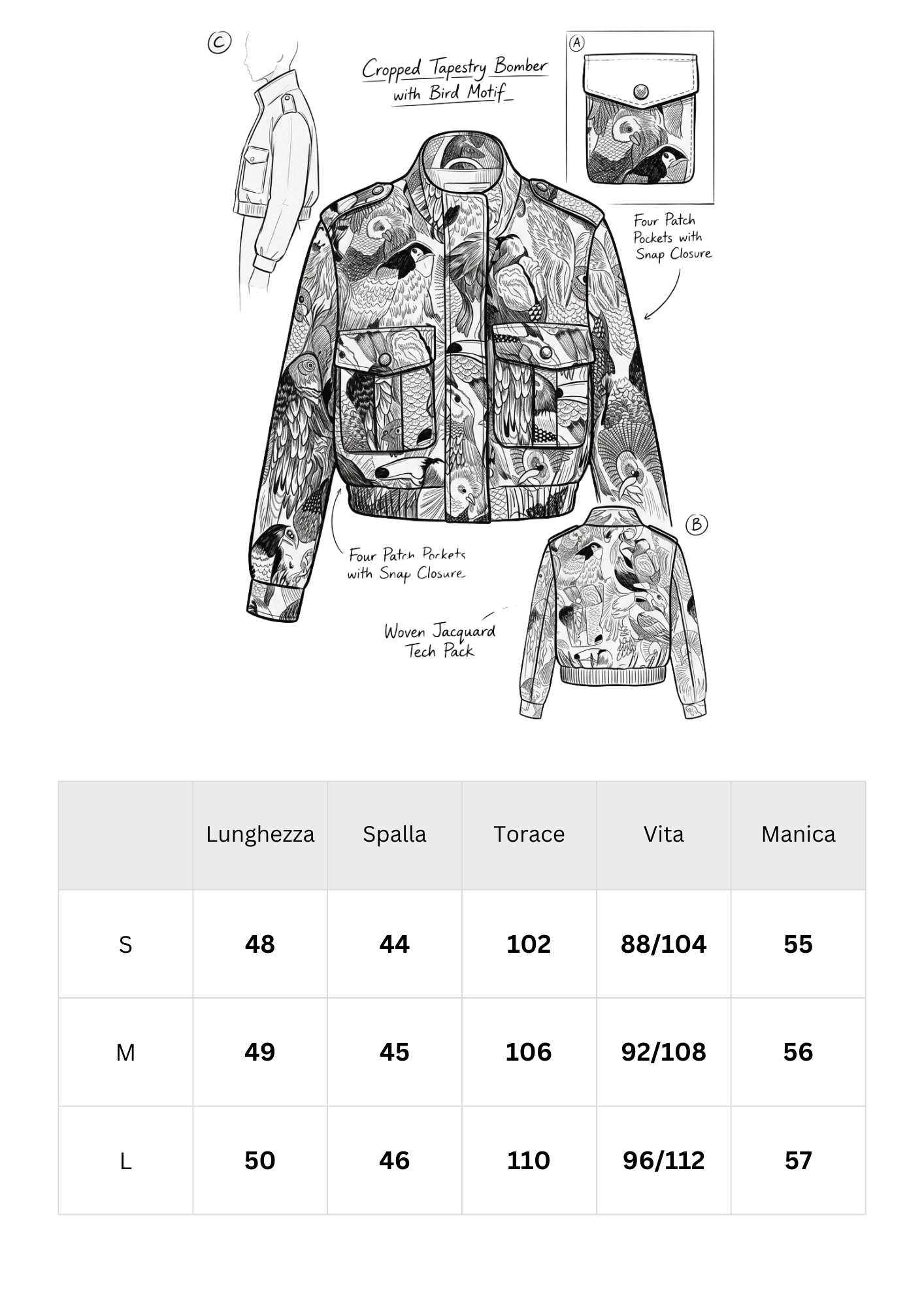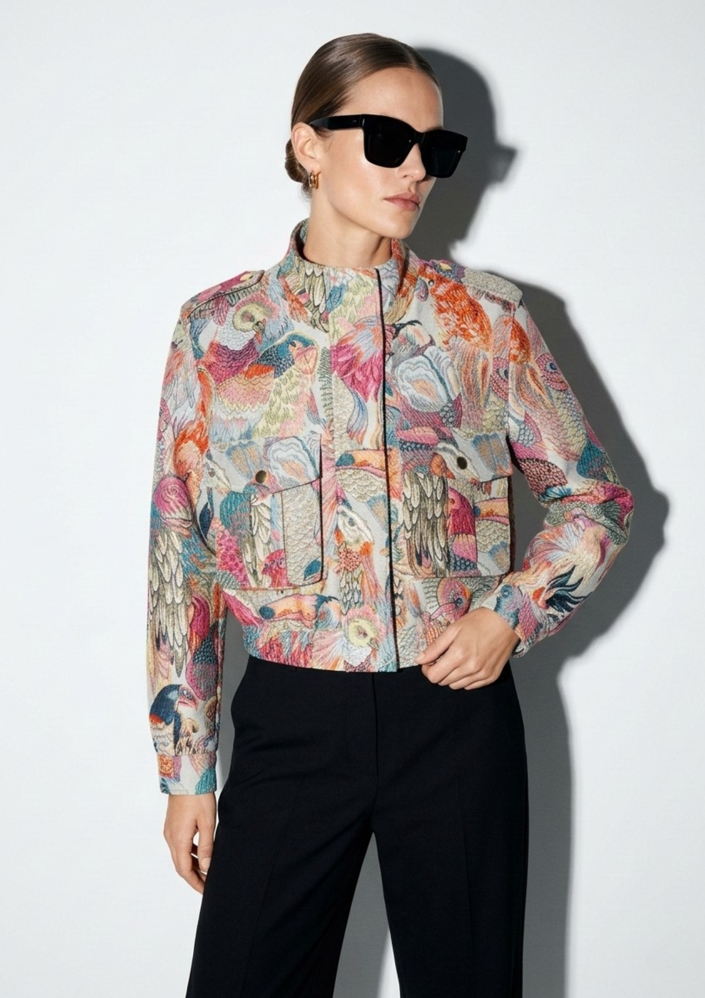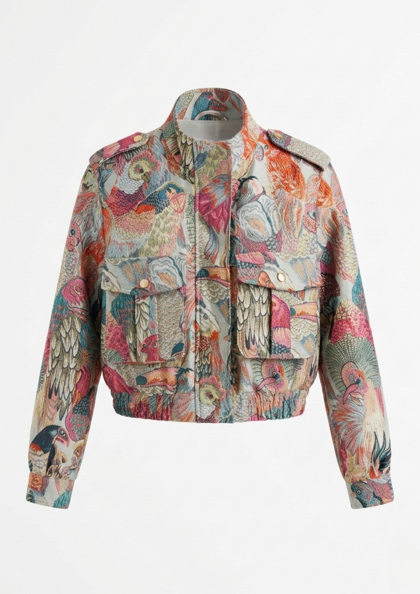 L’arte da indossare meets lo stile urban. Elevate il vostro guardaroba stagionale con questa esclusiva giacca bomber, un vero capolavoro di texture e colore. Caratterizzata da un ricamo intricato a tema avifauna su tutta la superficie, questa giacca trasforma un taglio sportivo in un pezzo d’alta moda accessibile.