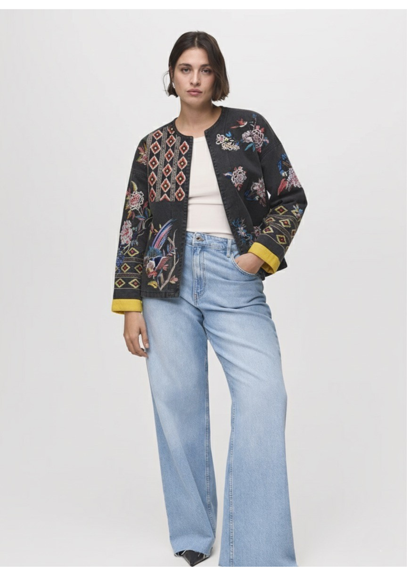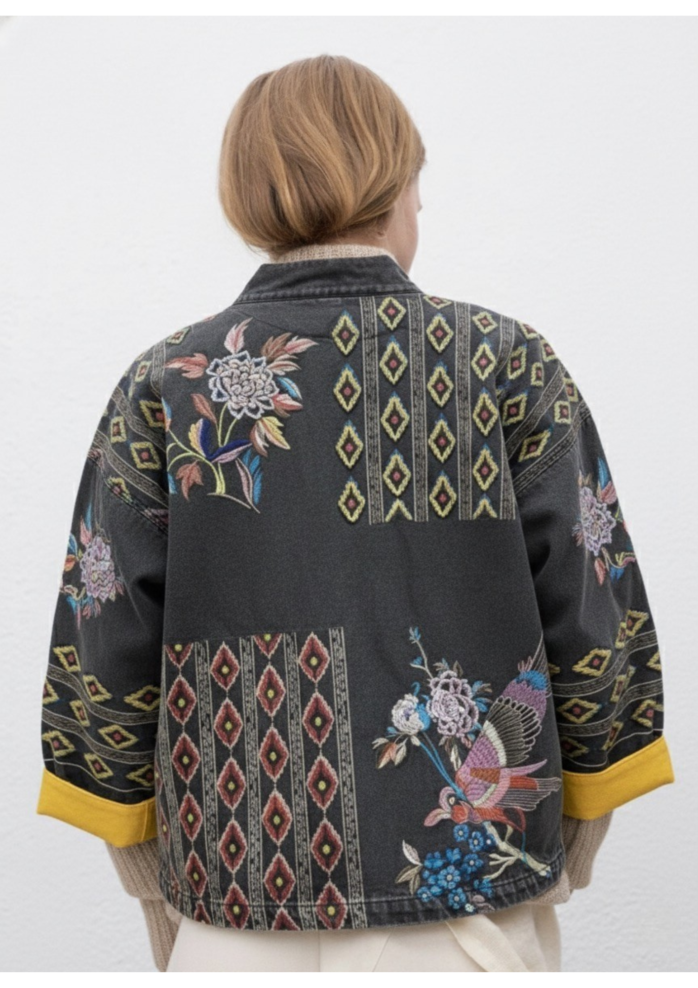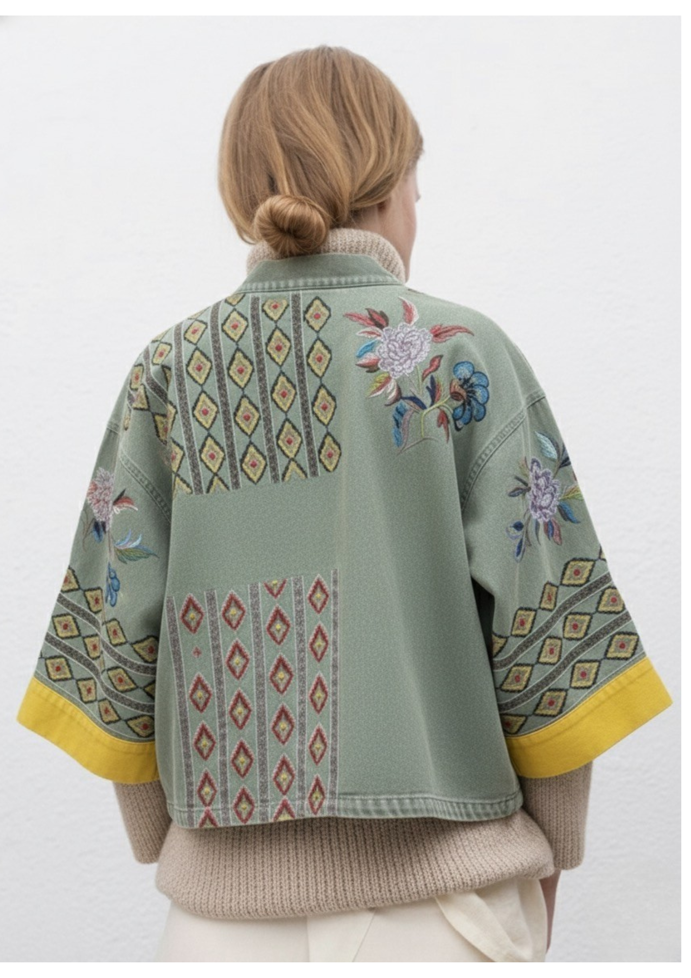 Tessuto: 95% cotone, 5% poliestere. Design dritto oversize. Collo rotondo. Ricamo a mano. Tasche invisibili. Chiusura con bottoni sul davanti. Fodera interna. Taglia unica, spalla: 55cm, lunghezza: 68cm, torace: 112cm, maniche: 54cm.
