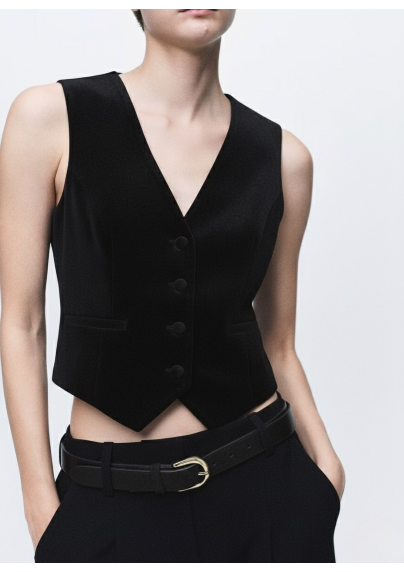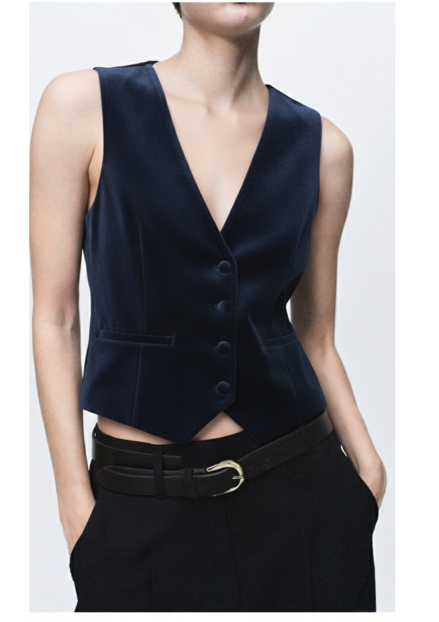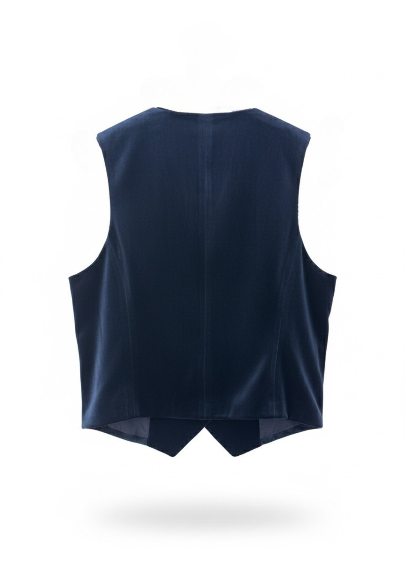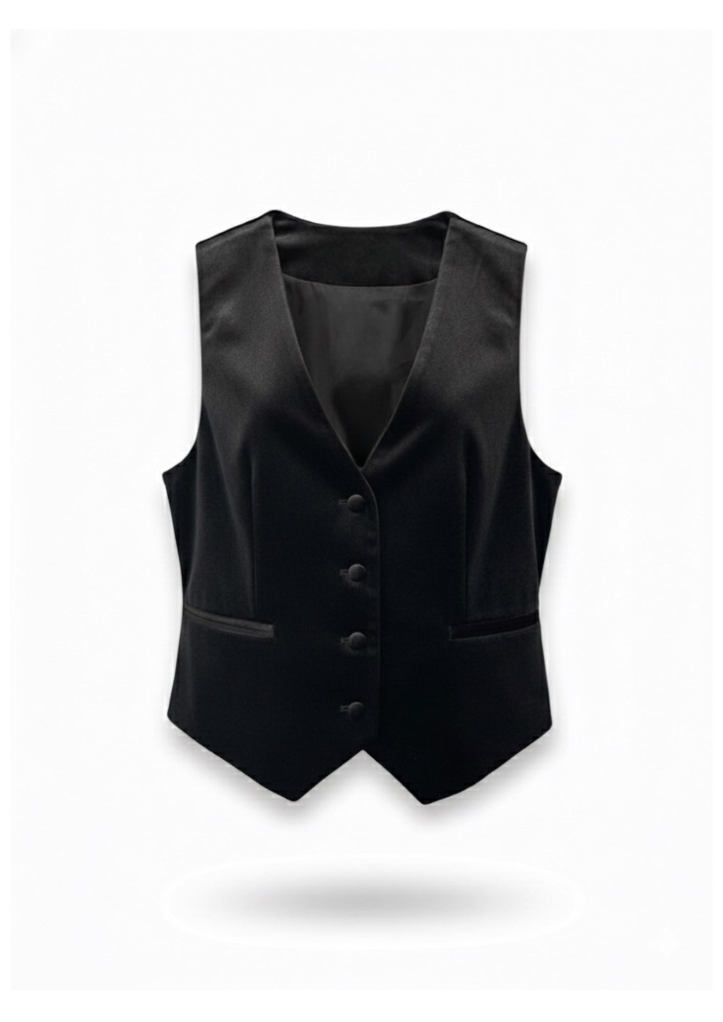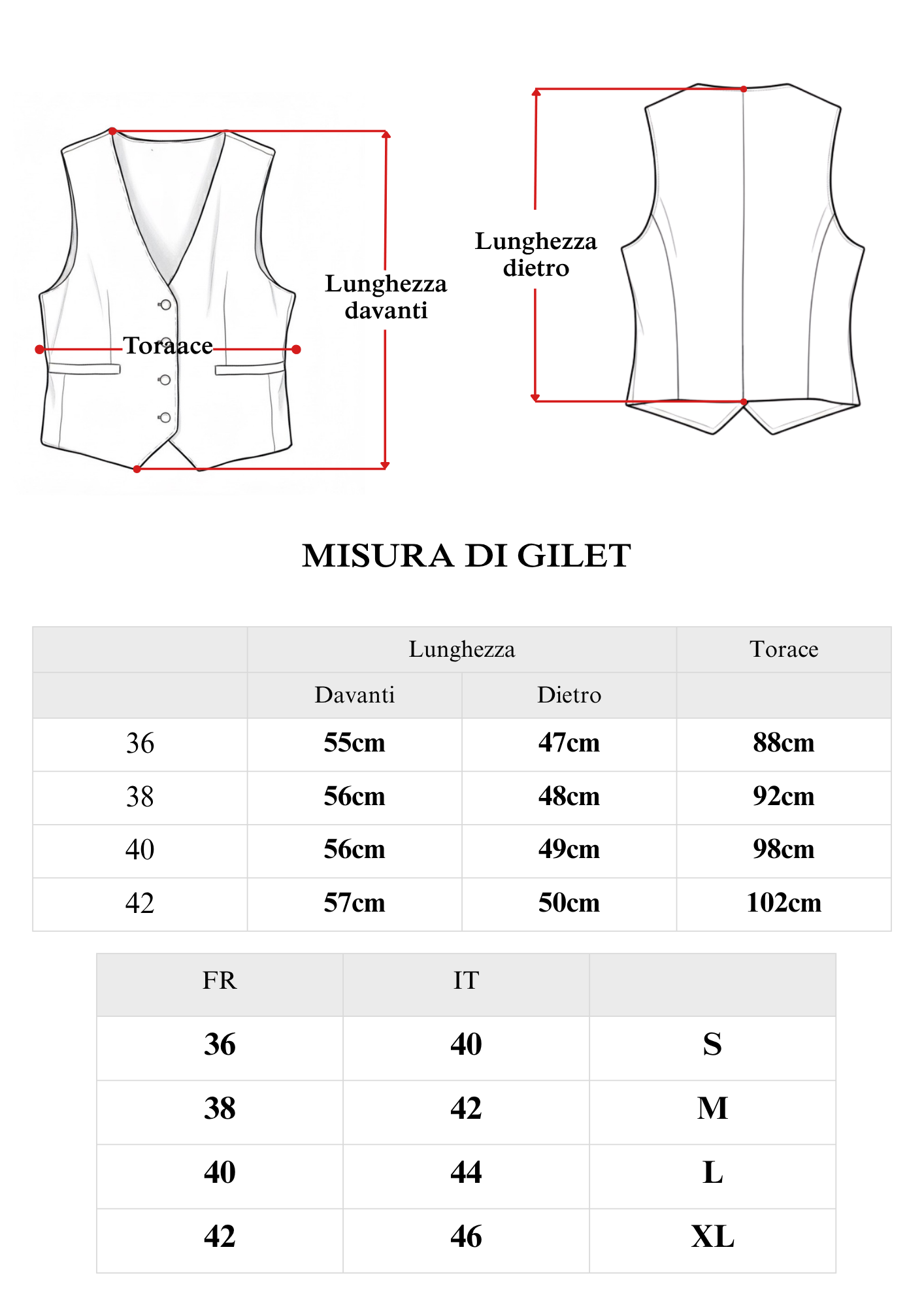 Tessuto: 95% poliestere, 5% elastano. Stile abito. Collo a V. Senza maniche. Due tasche laterali a filetto. Chiusura con bottoni sul davanti. Fodera interna. Misure francesi: 36-42, corrispondono misure italiane: 40-46.
