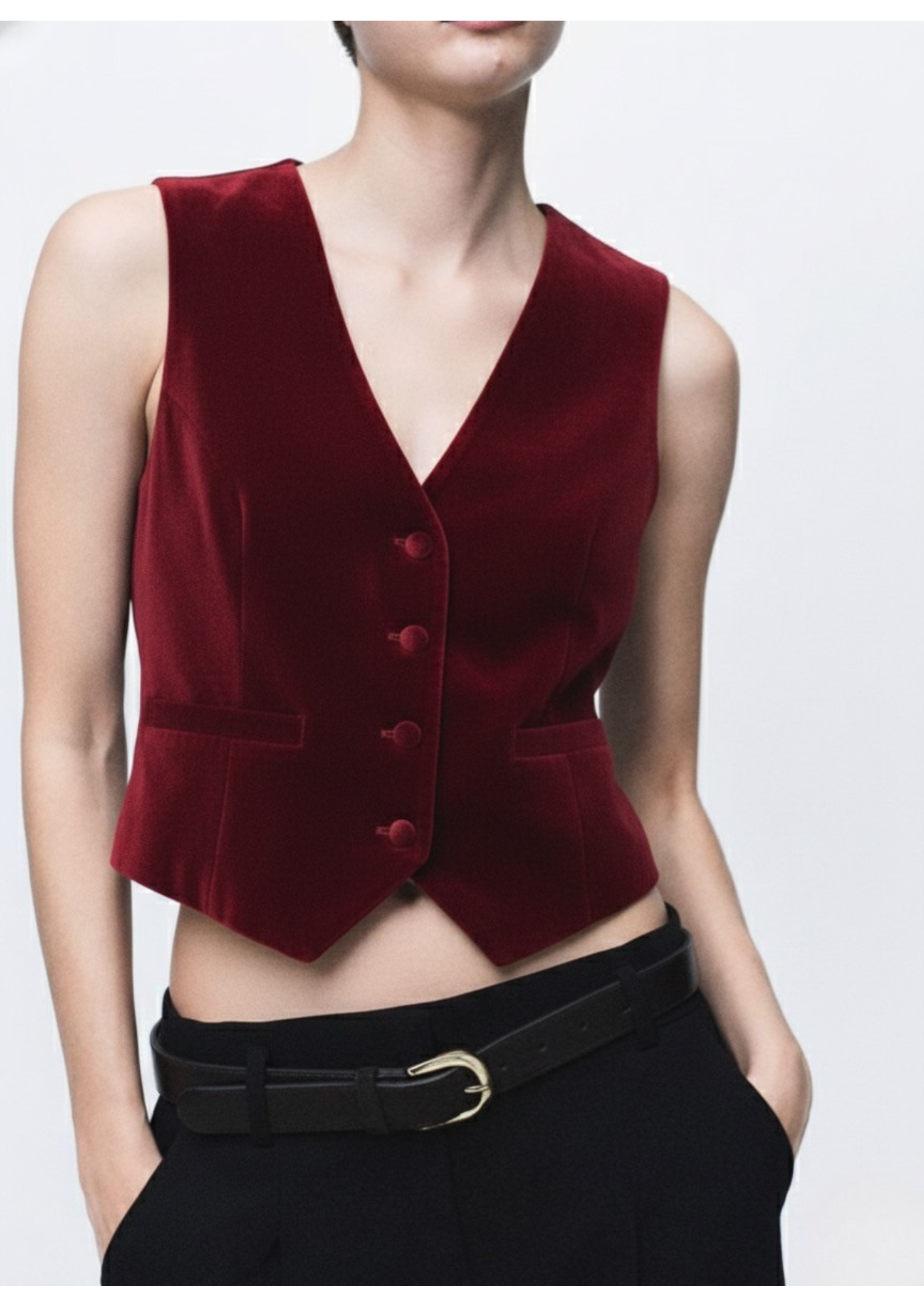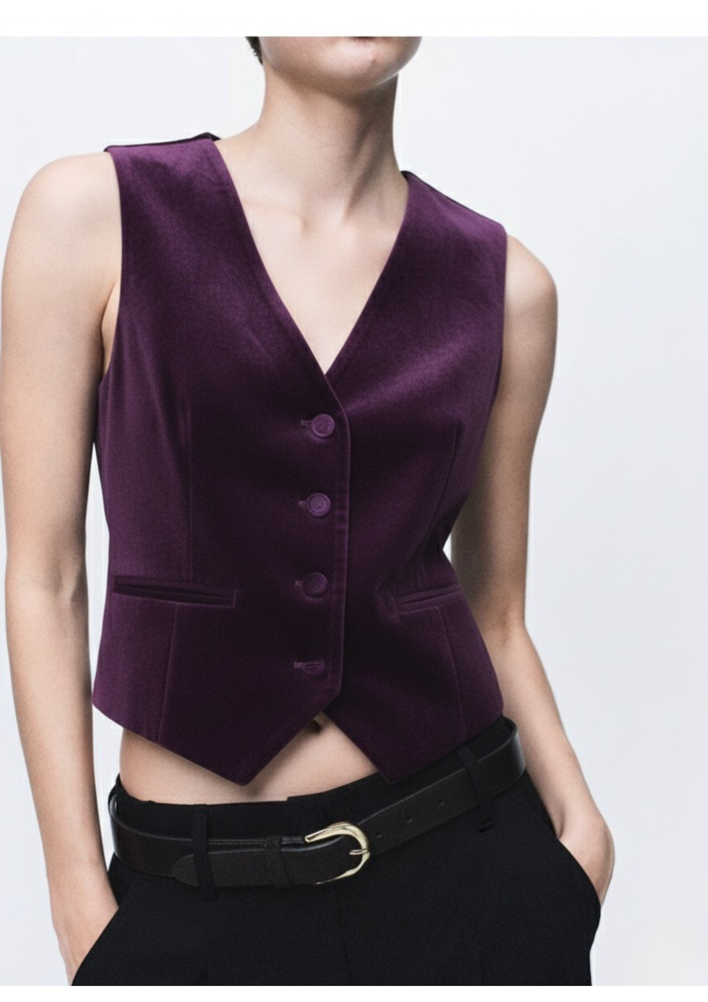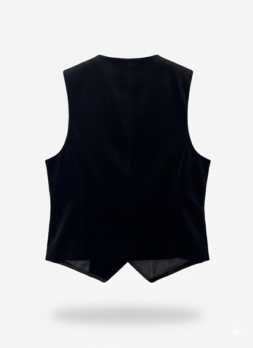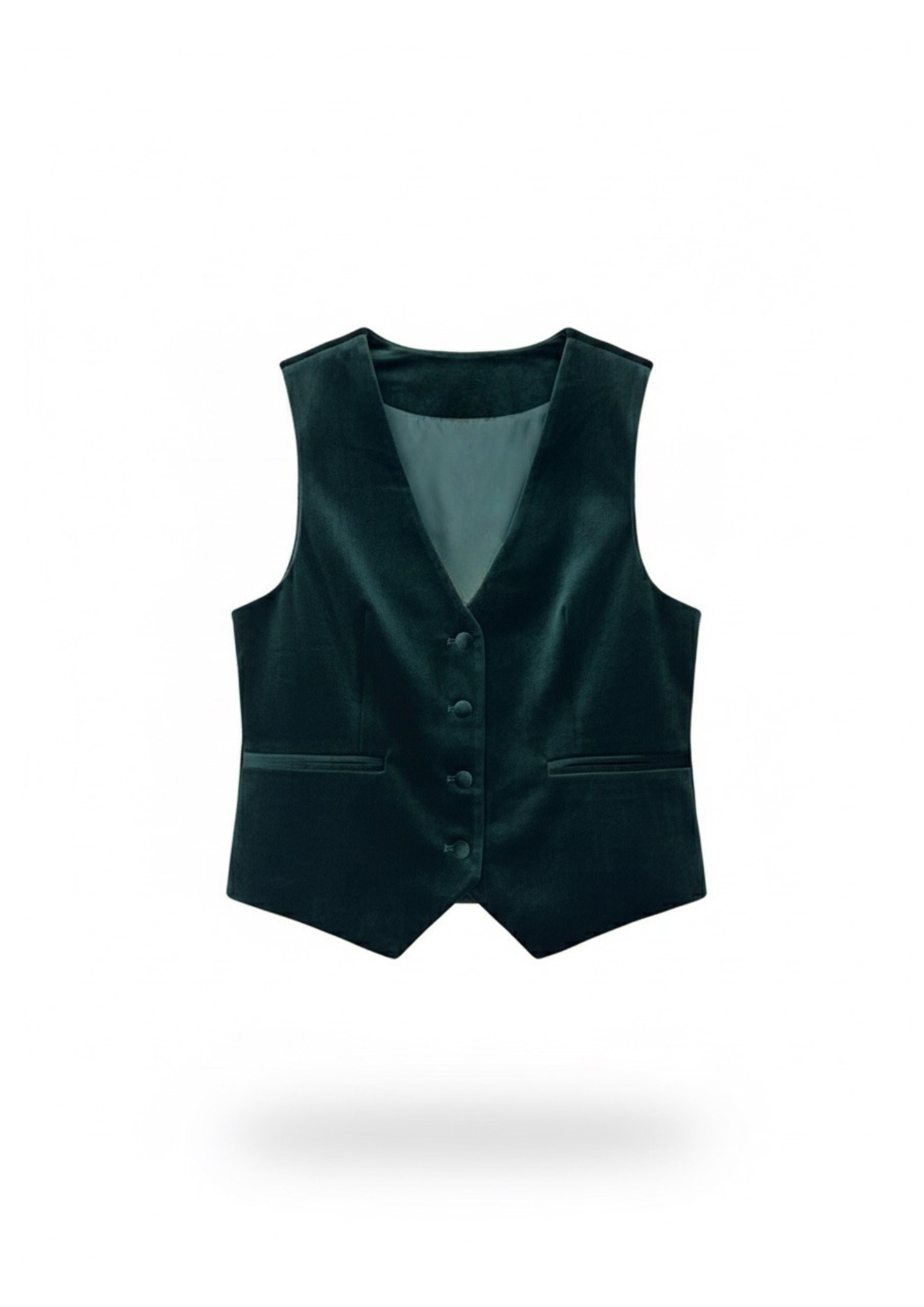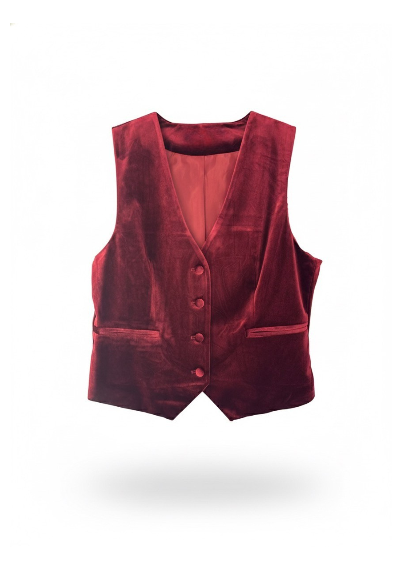 Tessuto: 95% poliestere, 5% elastano. Stile abito. Collo a V. Senza maniche. Due tasche laterali a filetto. Chiusura con bottoni sul davanti. Fodera interna. Misure francesi: 36-42, corrispondono misure italiane: 40-46.